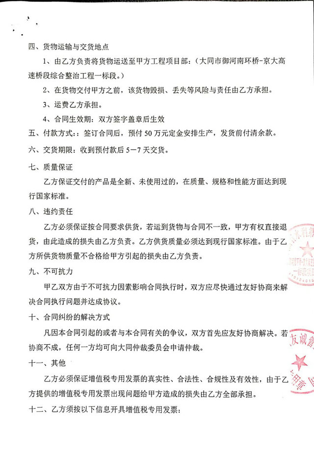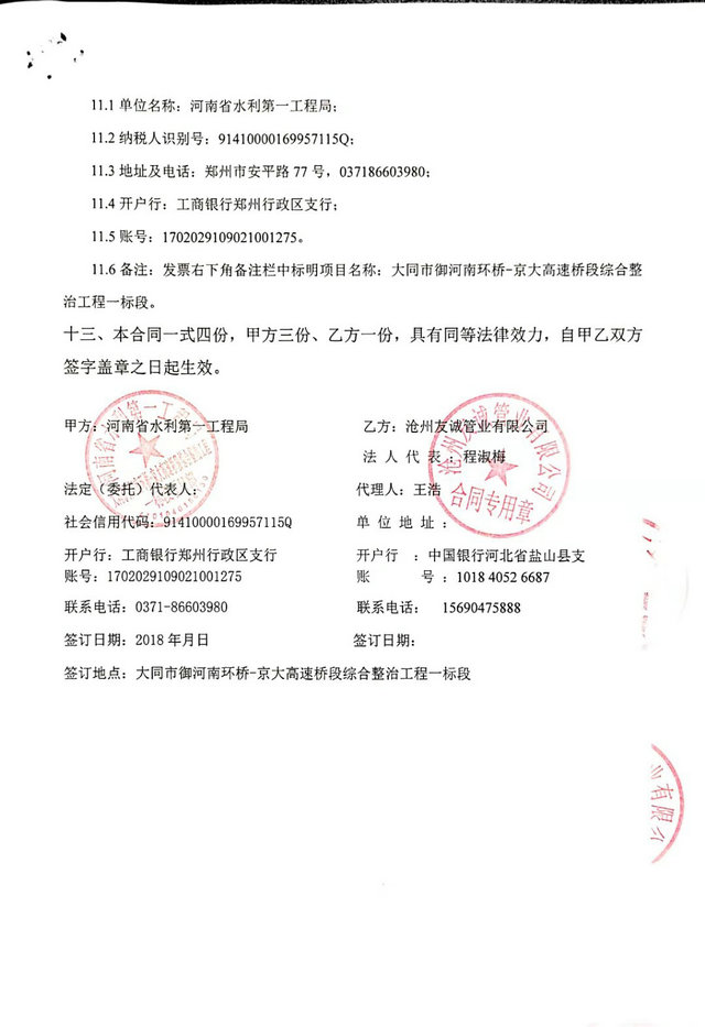 2018年我公司與河南省水利第一工程局合作,簽署大同市御河南環(huán)水利項(xiàng)目外PE內(nèi)EP防腐鋼管采購(gòu)合同,此工程管道尺寸為DN1200和DN600兩個(gè)規(guī)格,其鋼管防腐采用了最新型防腐形式-外PE內(nèi)EP防腐鋼管,防腐蝕強(qiáng)度高,作為地埋鋼管耐酸耐堿強(qiáng)度強(qiáng)度強(qiáng),能夠順利合作感謝客戶對(duì)我們的信任,采購(gòu)合同如下: